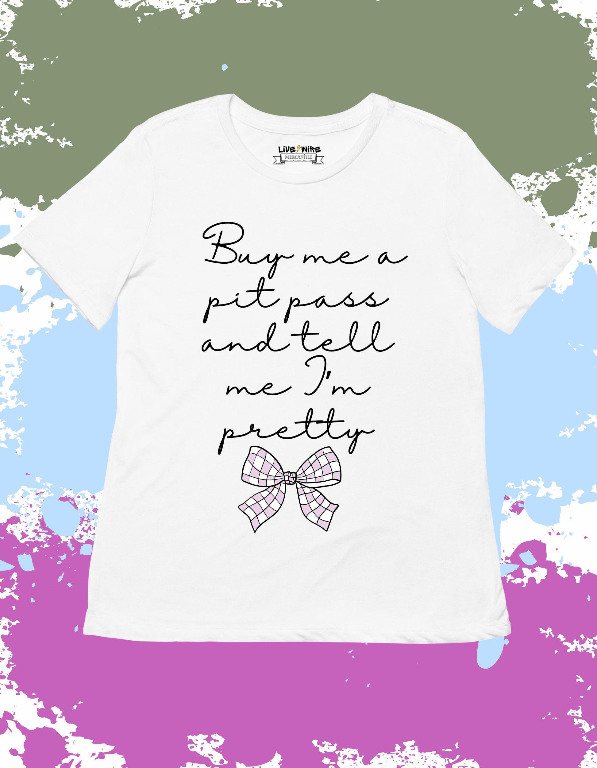 This shirt gets straight to the point: Buy me a pit pass and tell me I’m pretty. Printed in playful cursive with a pink and white checkered bow underneath, it’s giving race day meets main character energy.