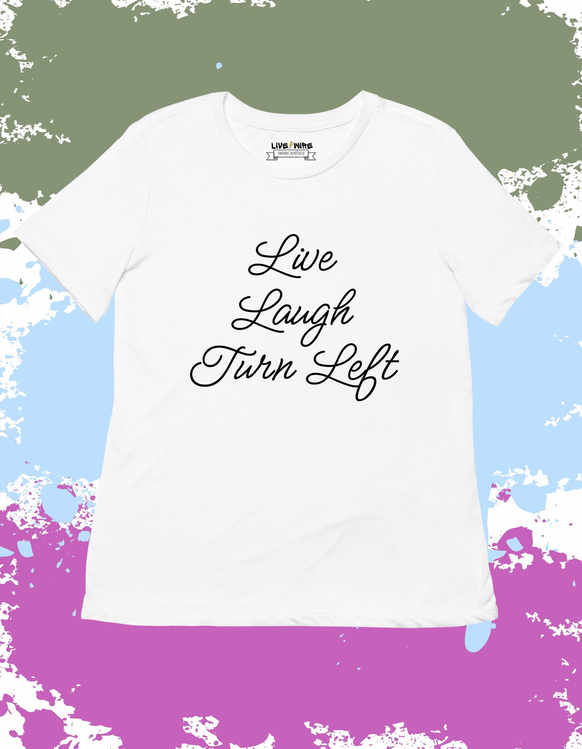 From the garage to the grandstands, this shirt keeps your priorities clear: live well, laugh often, and always turn left.
